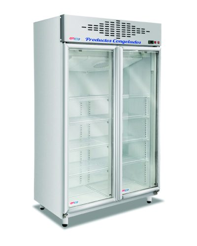 Puerta con marco de aluminio blanco, manija incorporada y termopanel triple vidriado calefaccionado. Burlete magnético y sistema de cierre con resorte de tensión.